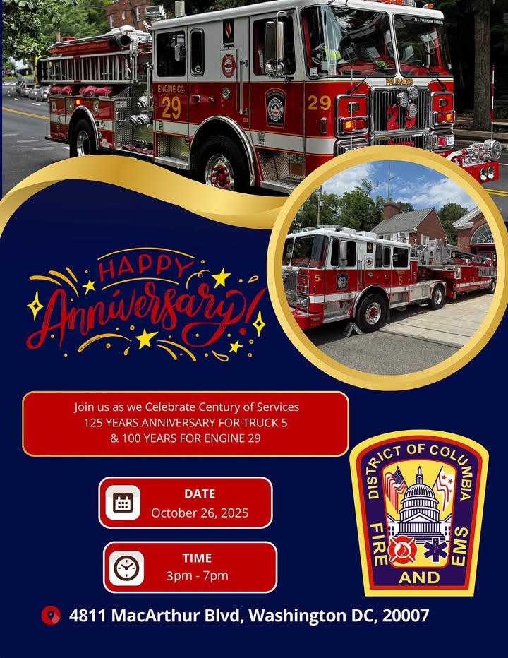 Anniversary for E-29 100 years and Truck 5 125 years. Celebration to be held at their quarters on Oct. 26, 2025 from 3-7 PM See Flyer below for more info: Aug. 22, 2025